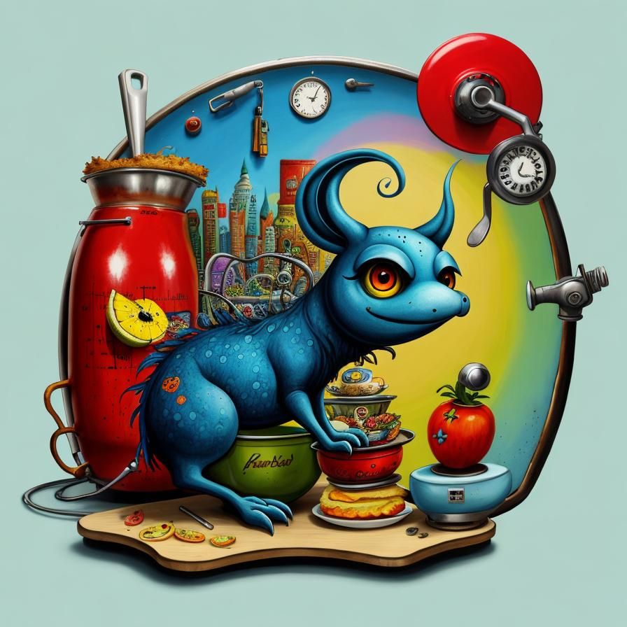 This image shows a bizarre cartoon hybrid of a creature and a vintage kitchen appliance. The artwork employs a whimsical style and a bright, technicolor palette to enhance its surreal quality.