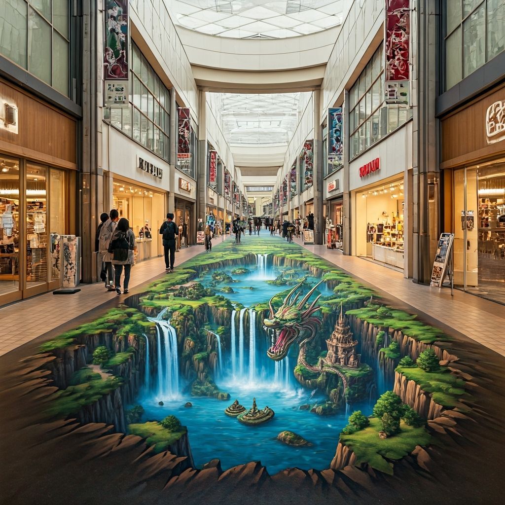 This image shows a hyperrealistic, maximalist digital painting of a giant dragon emerging from a Japanese shopping district. The artwork features intricate details, multiple levels, lakes, and waterfalls.
