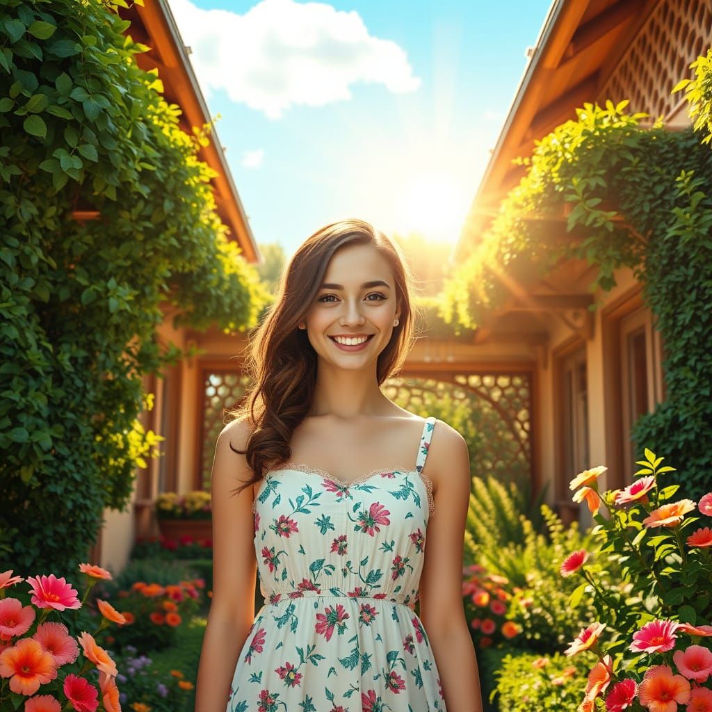 This image shows a young woman surrounded by lush greenery and vibrant flowers, basking in the warm sunshine of a picturesque summer villa, with a nostalgic, intricately detailed style reminiscent of Wes Anderson's films.