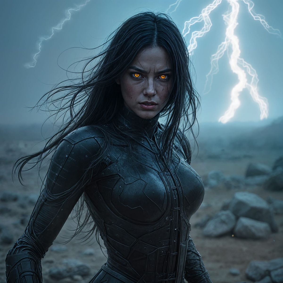 A striking picture of a fierce female warrior standing in a desolate, war-torn landscape. The image is rendered in a photorealistic style, with dystopian and mystical atmosphere.