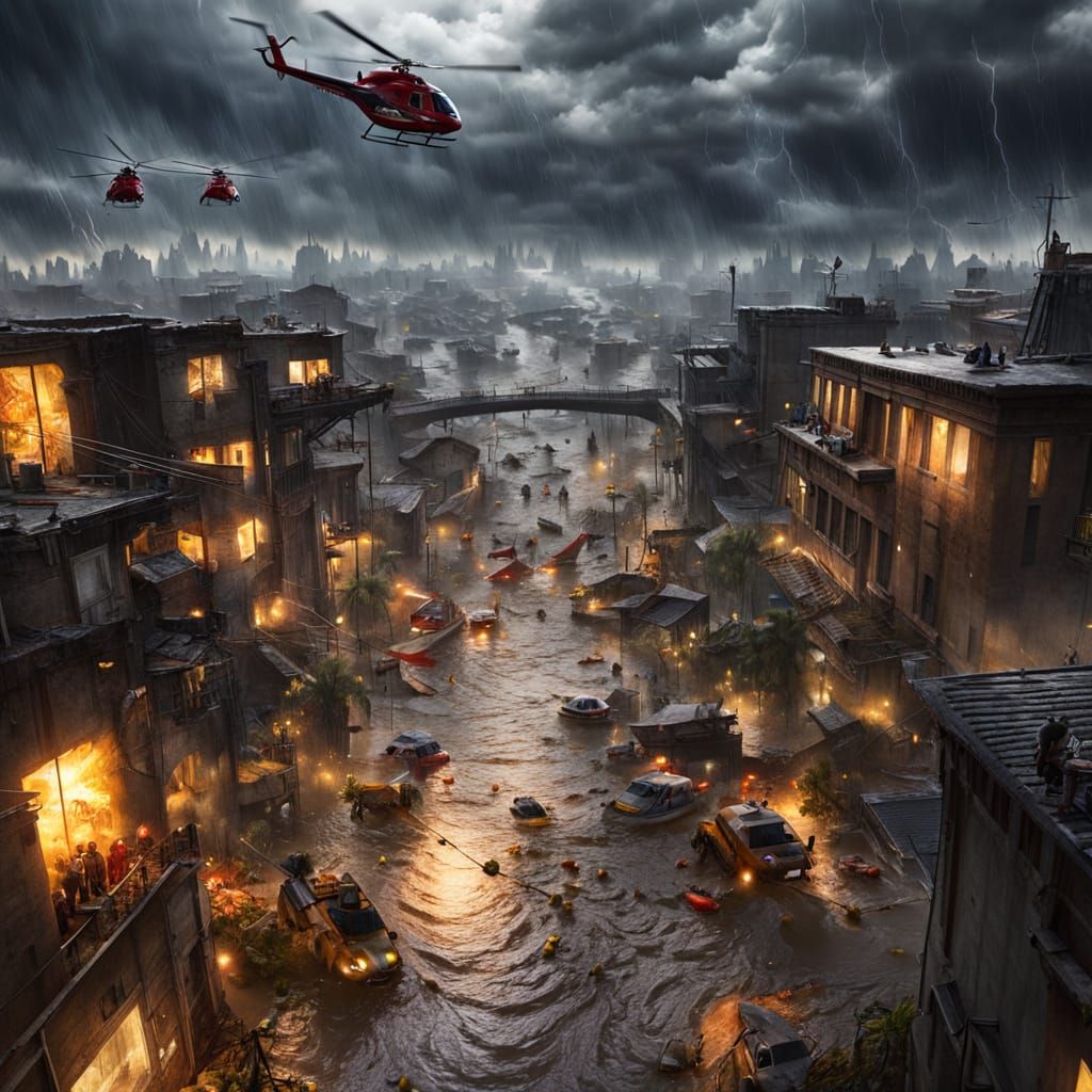 Quickly create your own dramatic flood scene images with our free and easy AI image generator.