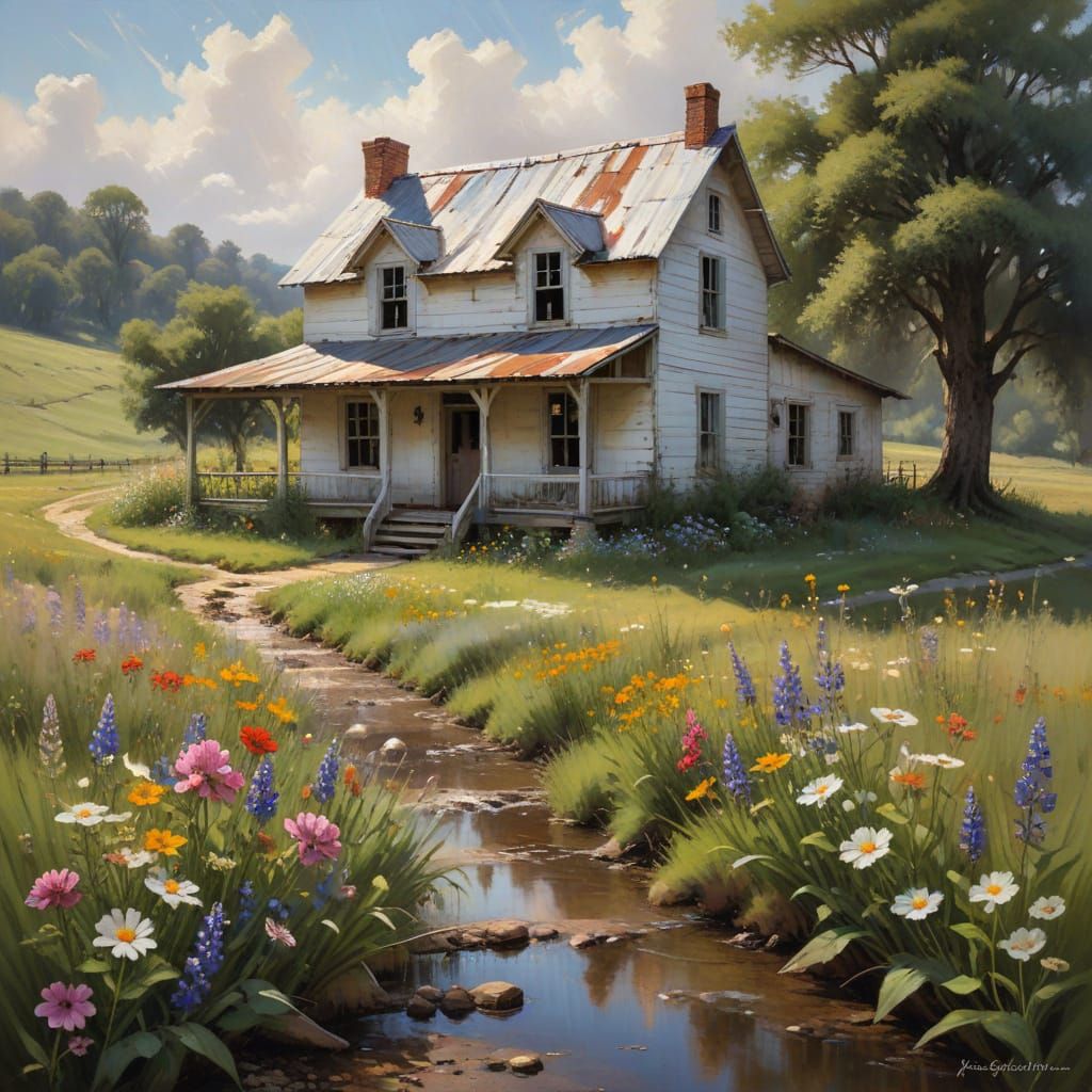 This image shows a sunlit white farmhouse surrounded by wildflowers and a stream. It's rendered with hyperrealistic detail, evoking the style of Conte crayon and charcoal drawings with cross-hatching and vignetting.
