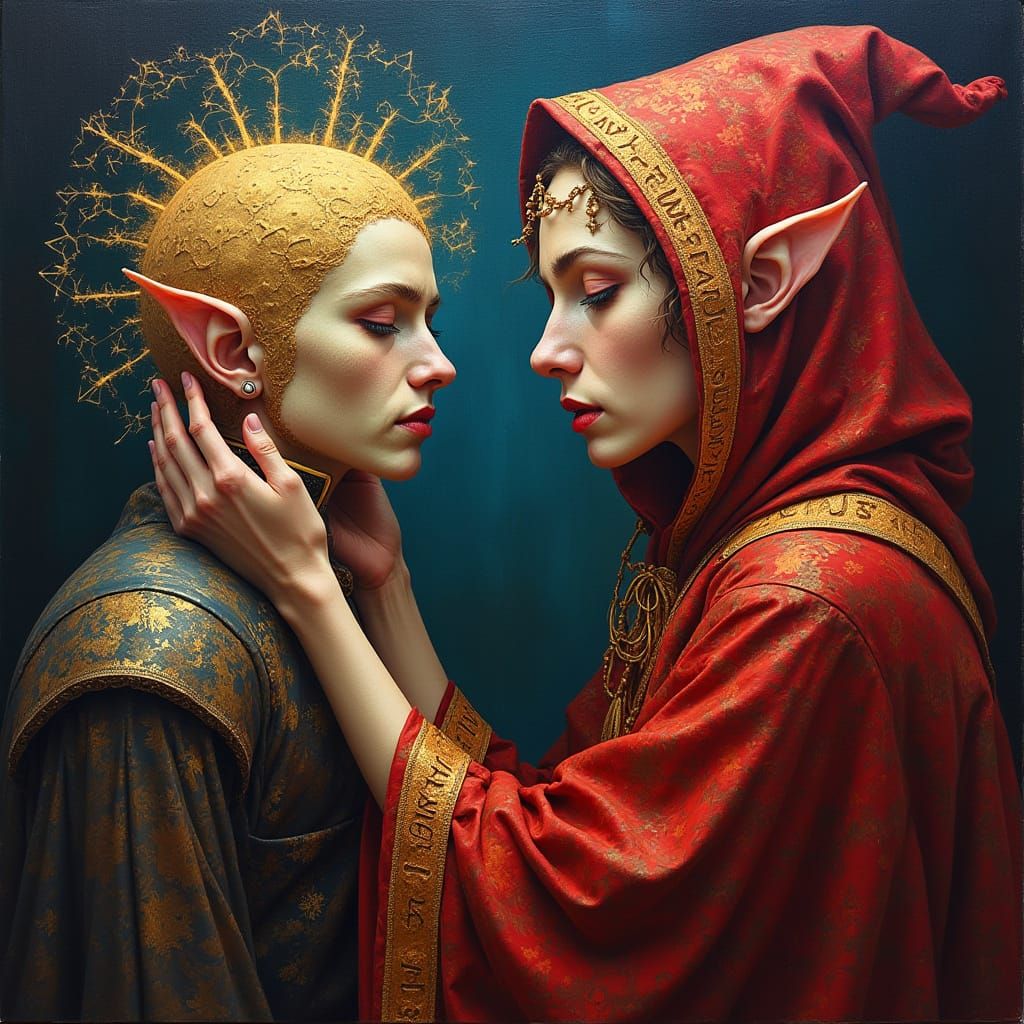 This image shows a blind gnome justice priestess dressed in elaborate robes, reading a prisoner's aura through her fingertips. The artwork is a vibrant, hyperdetailed fractal oil gouache painting on wood with a fantasy illustration style.