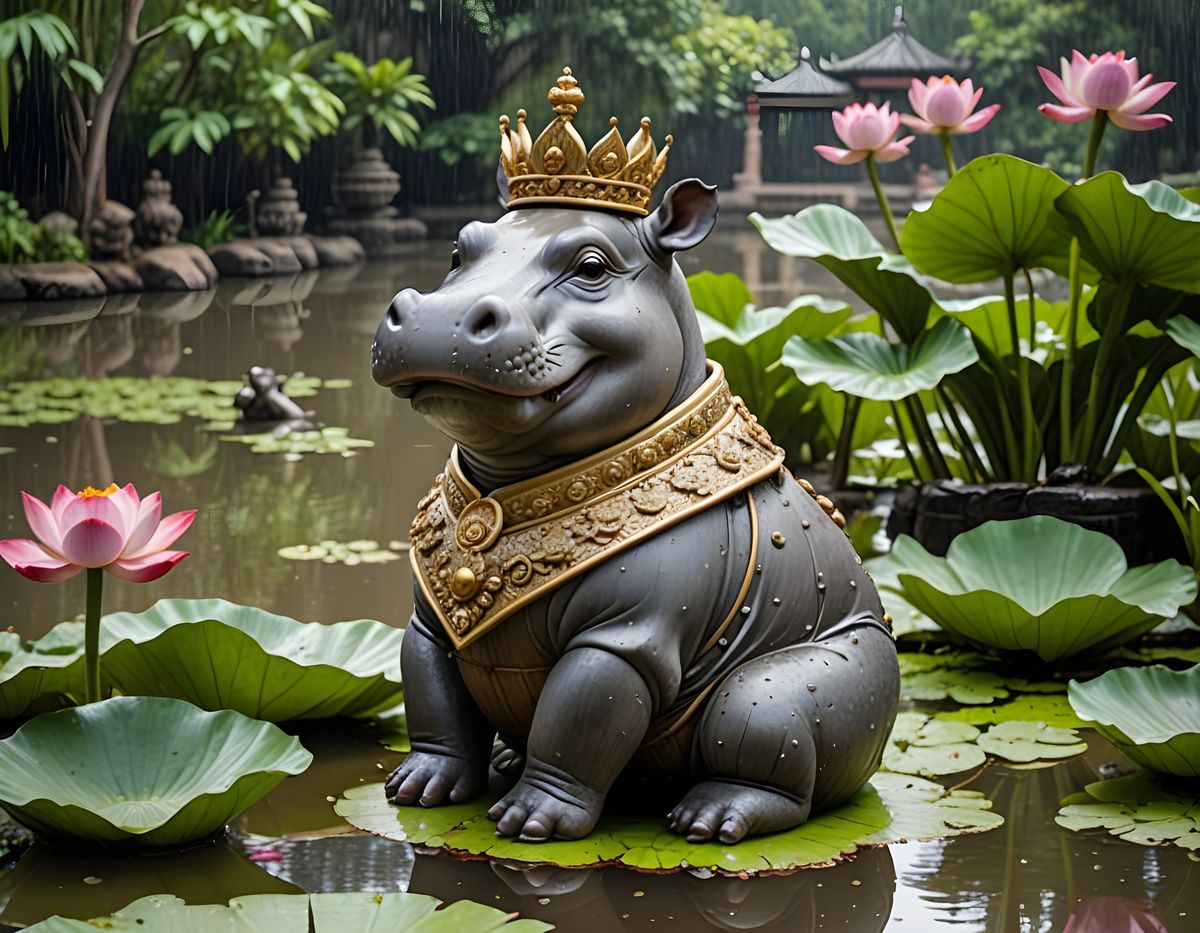 This image shows a side view of a baby hippopotamus sculpture wearing royal clothing, a crown, and Thai-style ornaments. It's situated in a lotus pond with light rain.