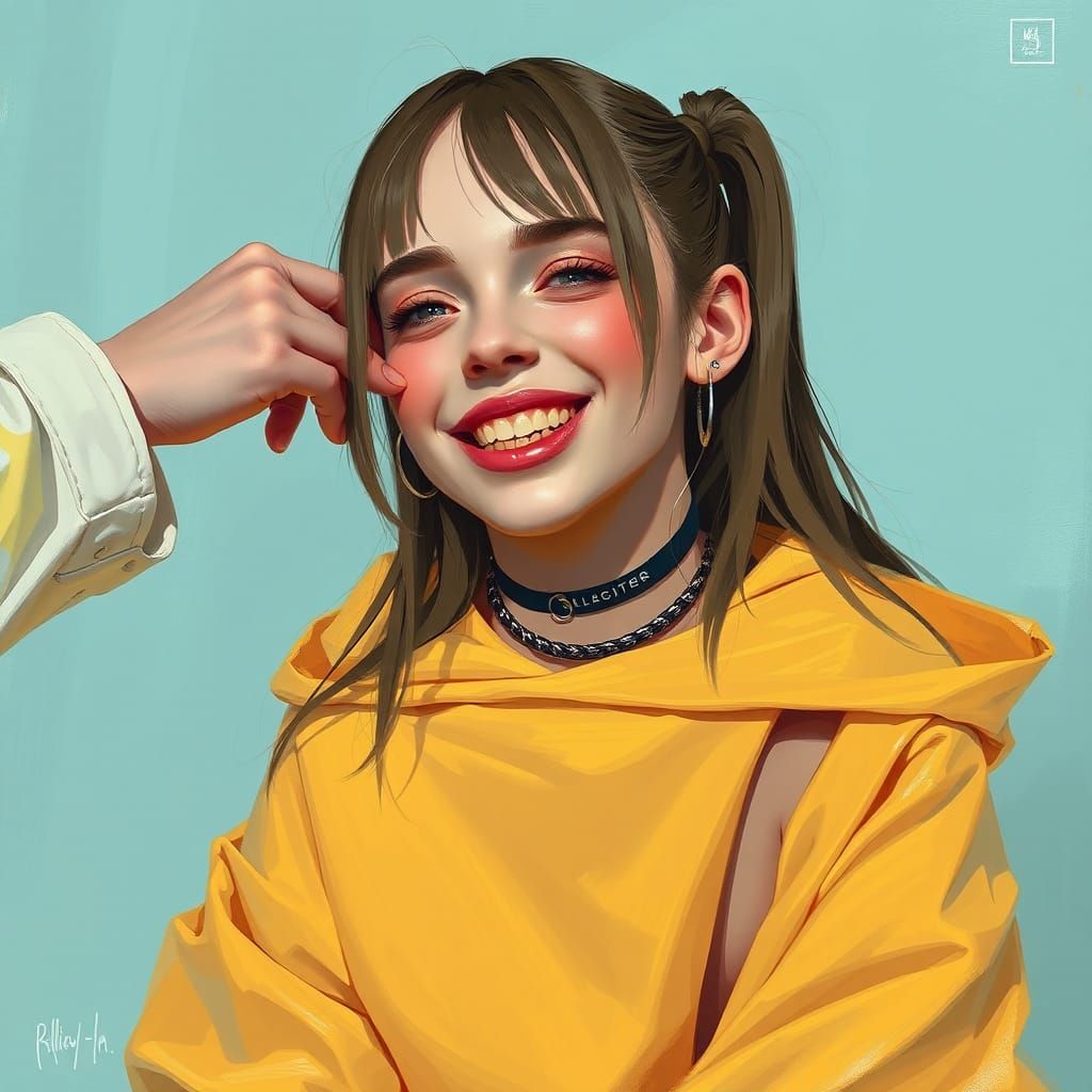 A digital portrait of Billie Eilish smiling as if being tickled. The image features a warm color palette with a futuristic pop art aesthetic.