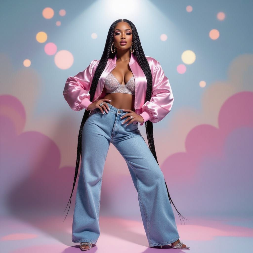 This image shows a confident African American woman posing in a crystal-embellished bomber jacket and designer jeans. The vibrant pastel background features graffiti and bokeh lights, rendered with high contrast and rich colors.