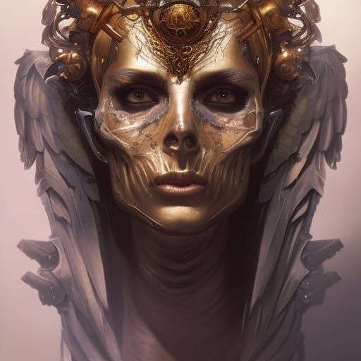 A striking picture of a death angel portrait with a golden halo and skeletal head. The piece features dynamic lighting, intricate details and a volumetric feel in a splash art style.