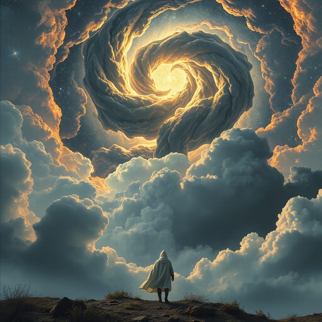 This image shows a solitary wanderer in a white cloak beneath a massive cosmic entity. The artwork features radiant stars and iridescent clouds, rendered with surreal, ethereal lighting effects.