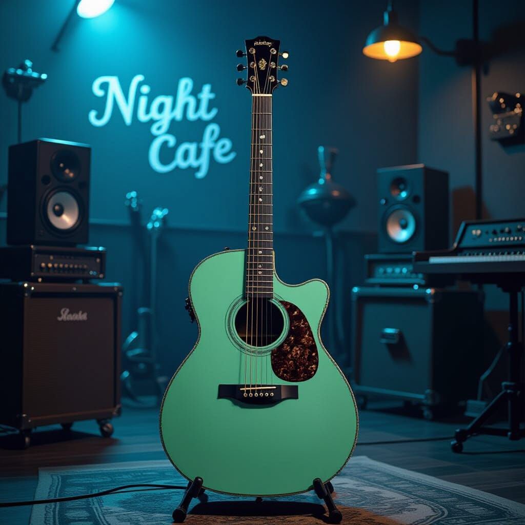 This image shows a light green steampunk acoustic guitar in a dimly lit home recording studio. The scene has a cinematic feel, with industrial and vintage elements in a retrofuturistic style.