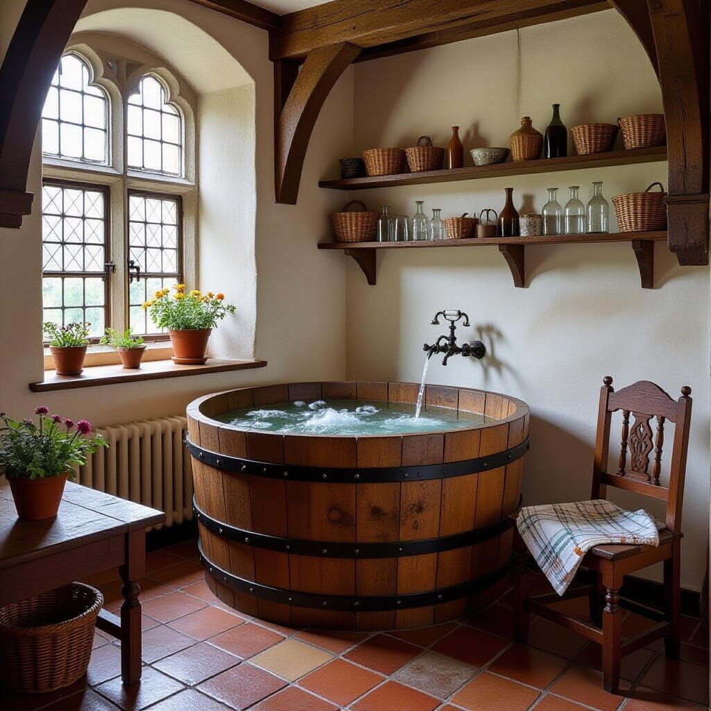 This image shows a medieval bathing room in 1473, featuring a large wooden tub filled with water and bubbles, evoking the style of old masters with warm light and a painterly atmosphere.