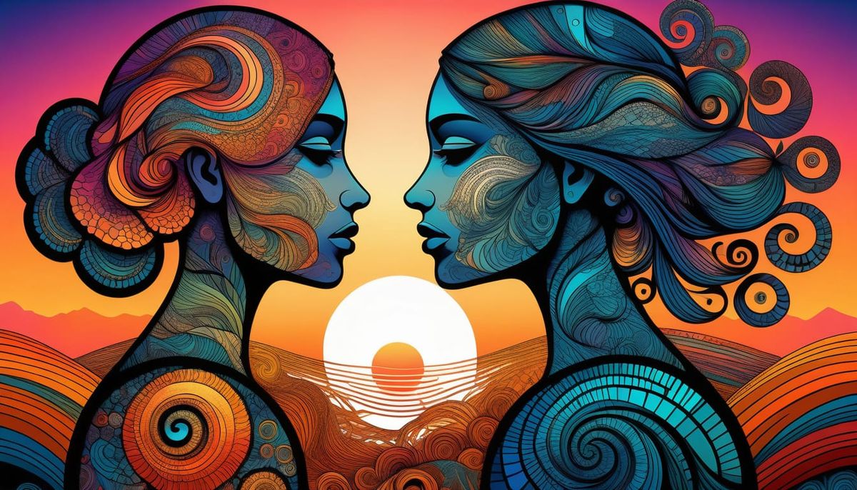This image shows a woman and a girl silhouetted against a vibrant sunset. The artwork features an art brut aesthetic with abstract fractal and Zentangle elements.