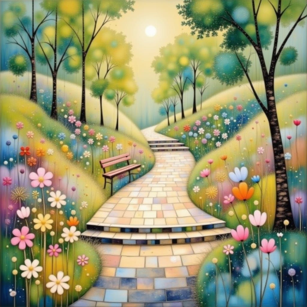 A vibrant park scene with colourful flowers and lush greenery. Soft focus and thick paint create a dreamy, whimsical atmosphere in a blend of neo-Impressionist and expressionist styles.