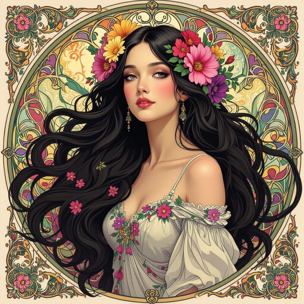 A portrait of a woman with long, flowing hair surrounded by colorful flowers. This image showcases an art nouveau style with intricate patterns and a dreamy, fantasy-inspired aesthetic.