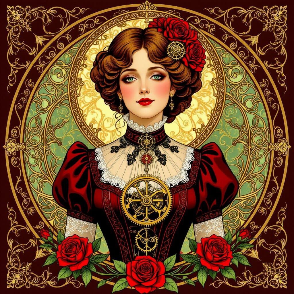 A full body portrait of a Victorian inventor in an Art Nouveau style, featuring a brass clockwork heart and surrounded by metal roses and machinery. Soft lighting highlights intricate linework and decorative elements.