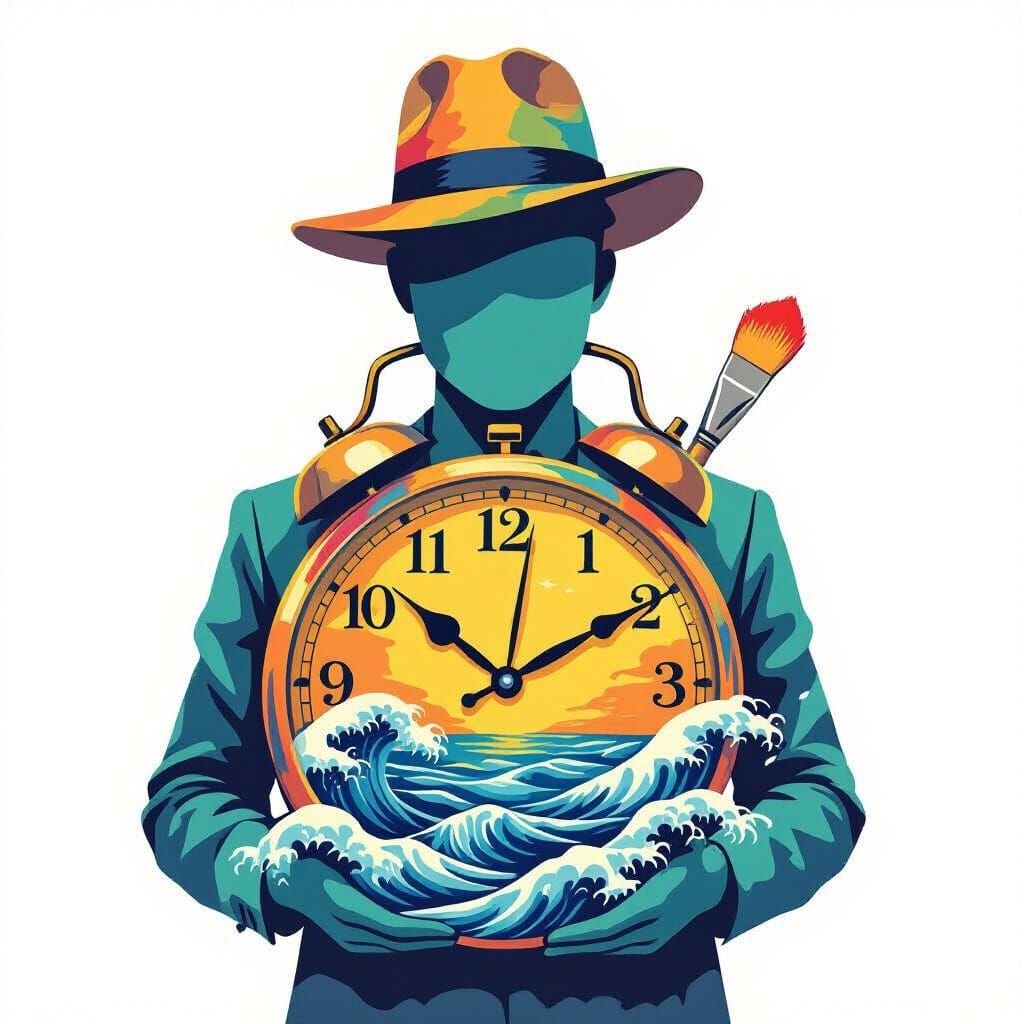 This surreal image features an abstract figure composed of a vibrant painter's palette for a head, a clock face without hands for a torso, and legs that transition into a vast ocean.
