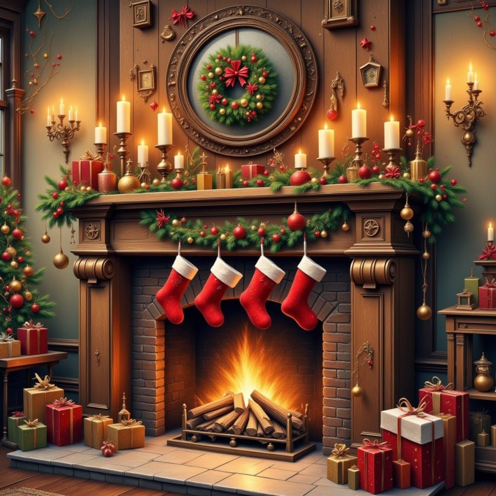 A festive fireplace adorned for Christmas, featuring hanging stockings, a wreath, and glowing candles, rendered in a textured impasto style.