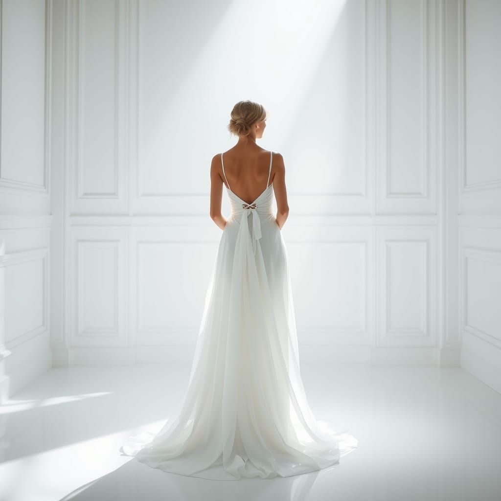 A radiant woman in a white gown stands serenely in an all-white room. The image evokes art nouveau aesthetics with ethereal and dreamy qualities.