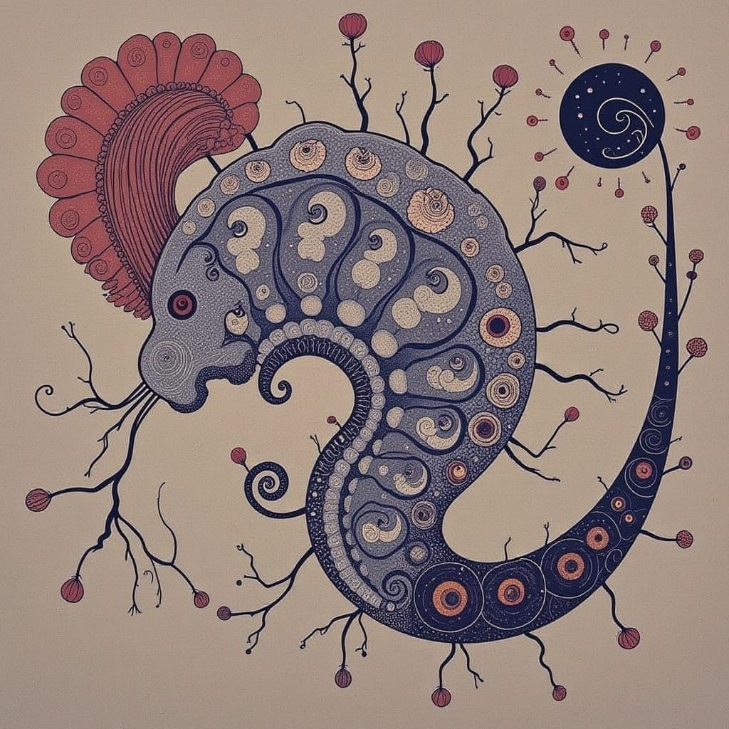 This image is a vibrant, otherworldly depiction of a spaceman in sync with a cicada's song, blending elements of science fiction and natural wonder.