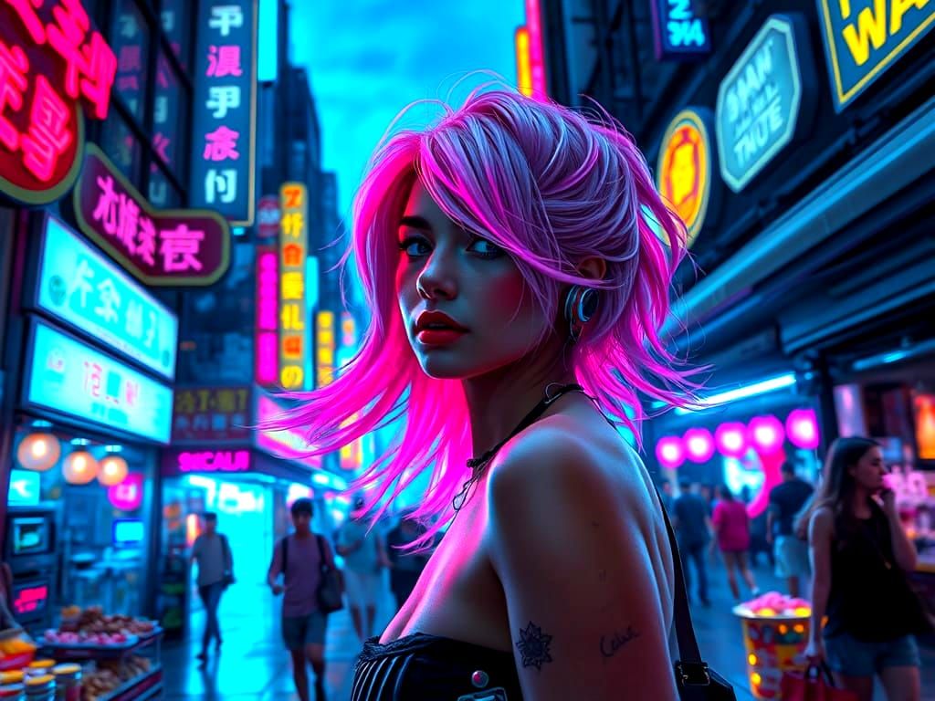 This image shows a crowded cyberpunk street scene at dusk, full of neon lights and holographic ads. A woman with cybernetic enhancements walks through the futuristic market in a hyperrealistic style.