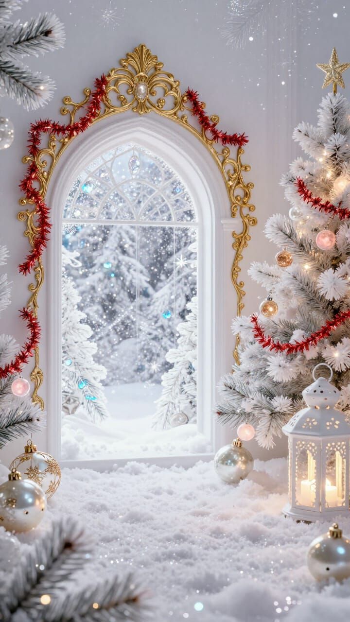 This image showcases a macro view of a fluffy winter scene in a naive art style with holographic accents. It features ivory, white gold, and glitter with baroque-inspired garlands and delicate vintage toys.