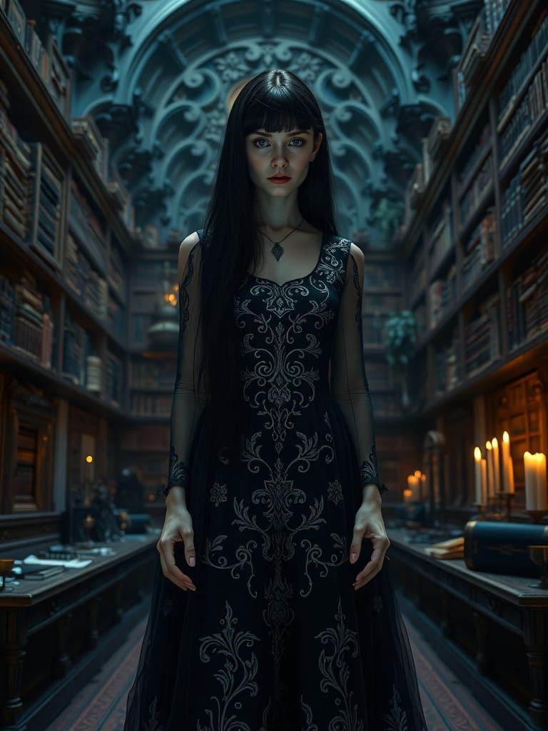 This image shows a mysterious woman surrounded by ancient tomes and mystical artifacts in a dimly lit library. She wears a flowing black gown with intricate embroidery, her pale skin glowing softly in the dim light.