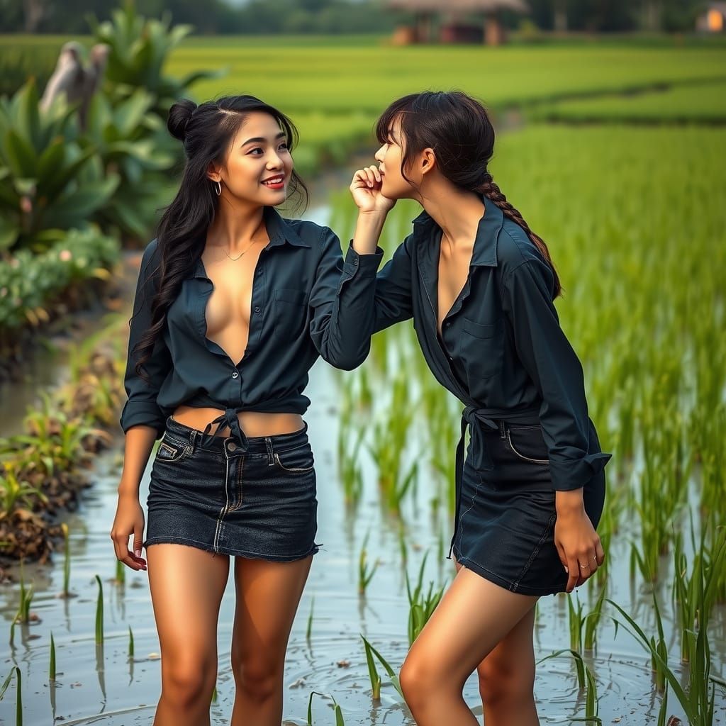 This image shows two young women sharing a kiss in a flooded rice paddy in Korea. Lush greenery surrounds them in this romantic scene with vibrant colors and delicate lighting.