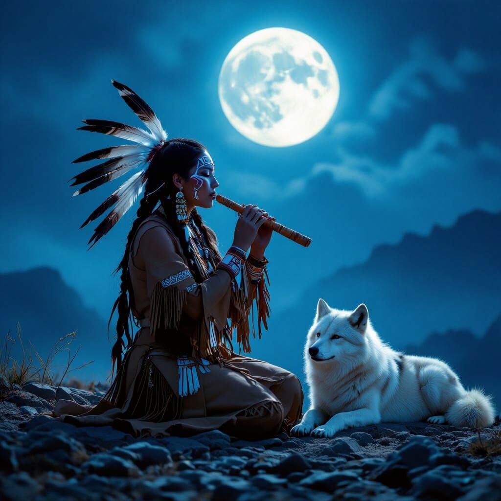 This image shows a Native American woman playing a flute under the moon, in traditional dress. The scene features a wolf, mystical fog, and cinematic lighting, creating a spiritual atmosphere.