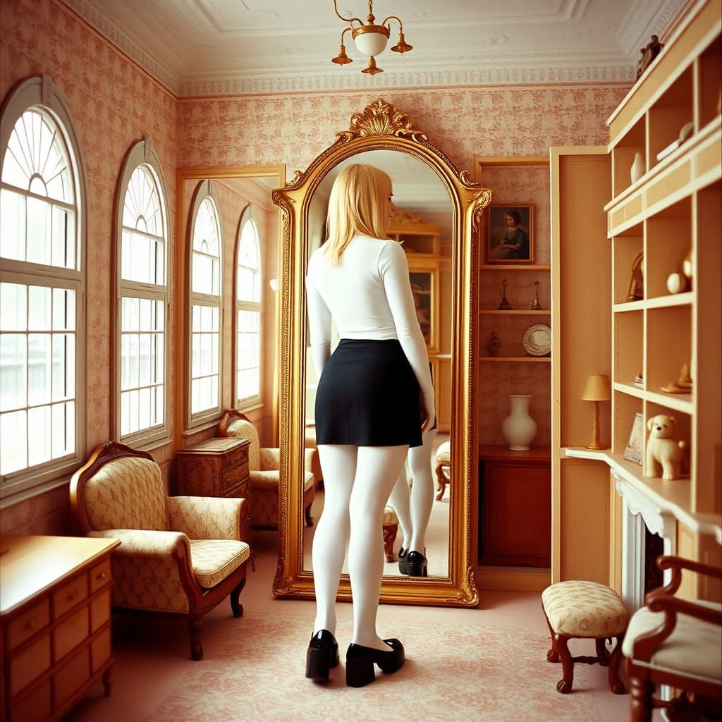 A stunning cinematic image of a blonde woman standing in a lavishly furnished dollhouse, gazing into a warped mirror that distorts her reflection. Shot in film style with a blend of atmospheric lighting and film grain effects.