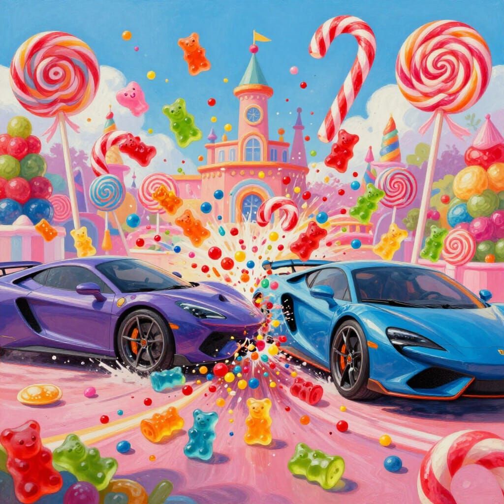 This image depicts two sports cars crashing amidst a vibrant Candyland scene. Gummy bears, lollipops, and candy canes burst outwards in a dynamic swirl of confectionery, rendered in a detailed gouache painting style with saturated colors.