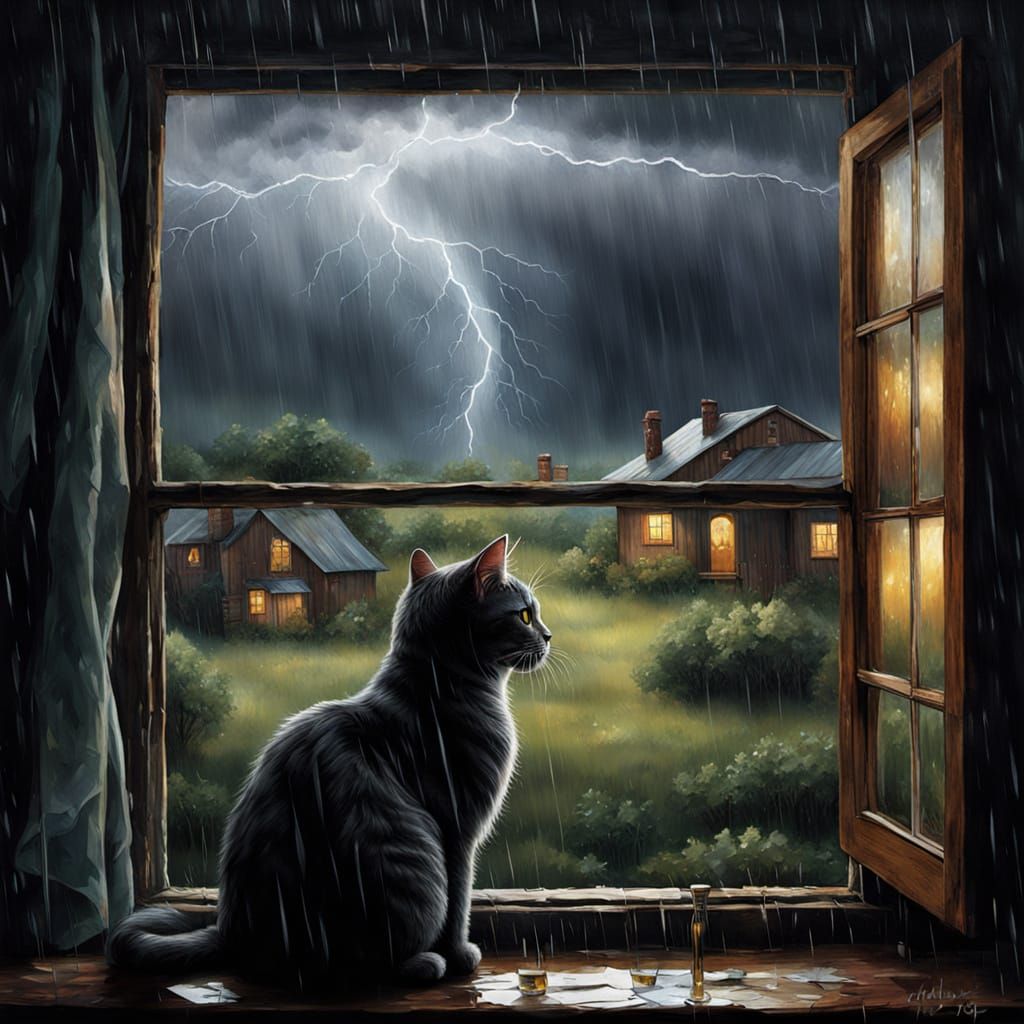A striking picture of a solitary house, showcasing a cat gazing out at the rain. Lightning illuminates the stormy sky in this atmospheric, surreal, and incredibly detailed image with dim, golden lighting.