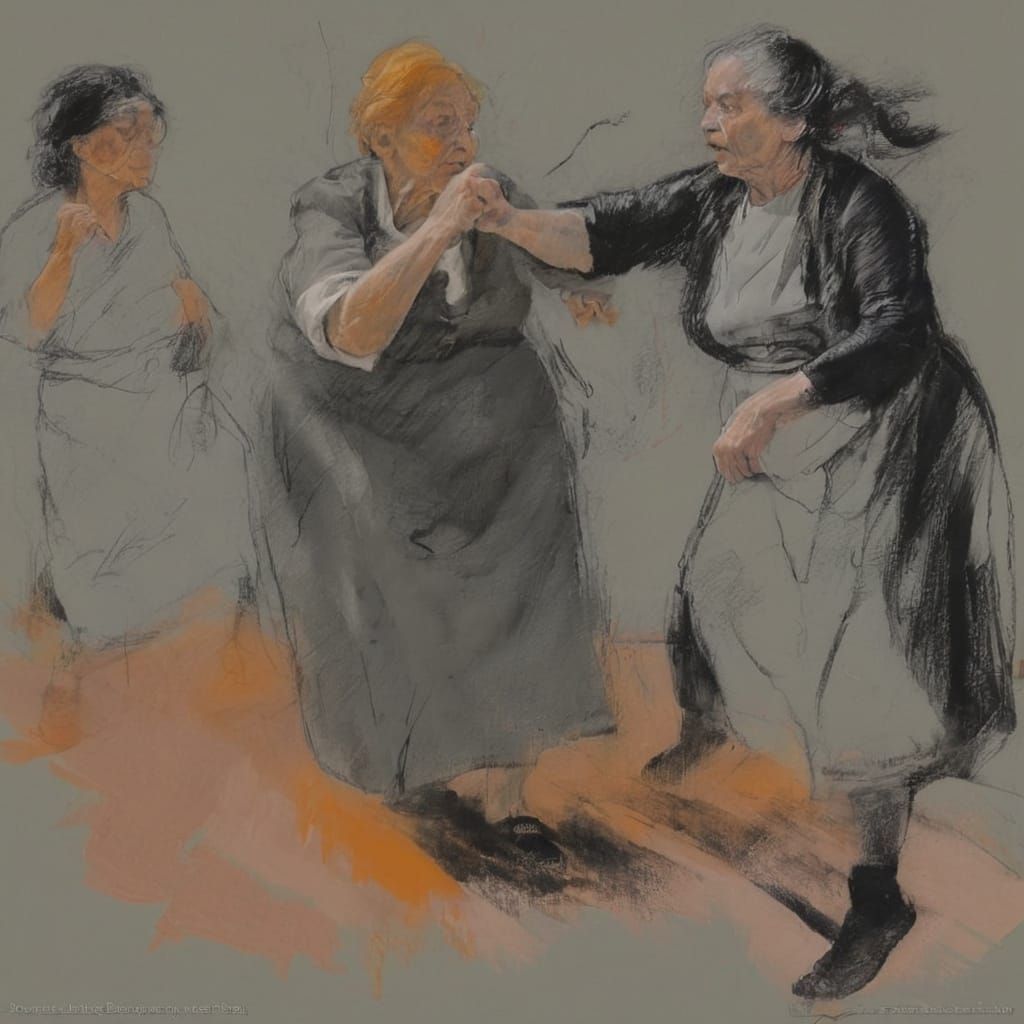 This expressive drawing depicts elderly women engaged in a street fight in Toulouse, rendered with energetic charcoal and pastel lines. The artwork features dramatic lighting and rough textures for a gritty, dynamic feel.