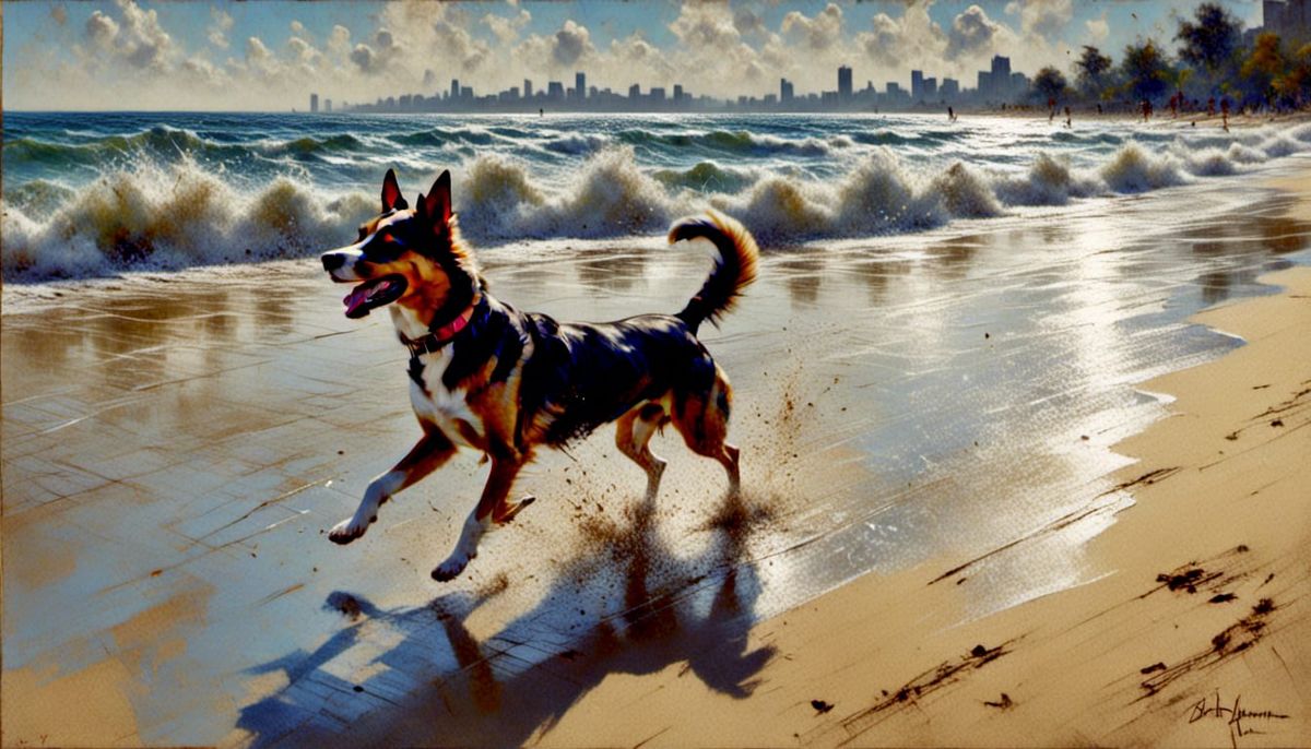 A vibrant impressionistic painting of a dog joyfully running on a sandy beach, kicking up sand. The artwork uses soft brushstrokes and dappled sunlight to convey a dreamy atmosphere.