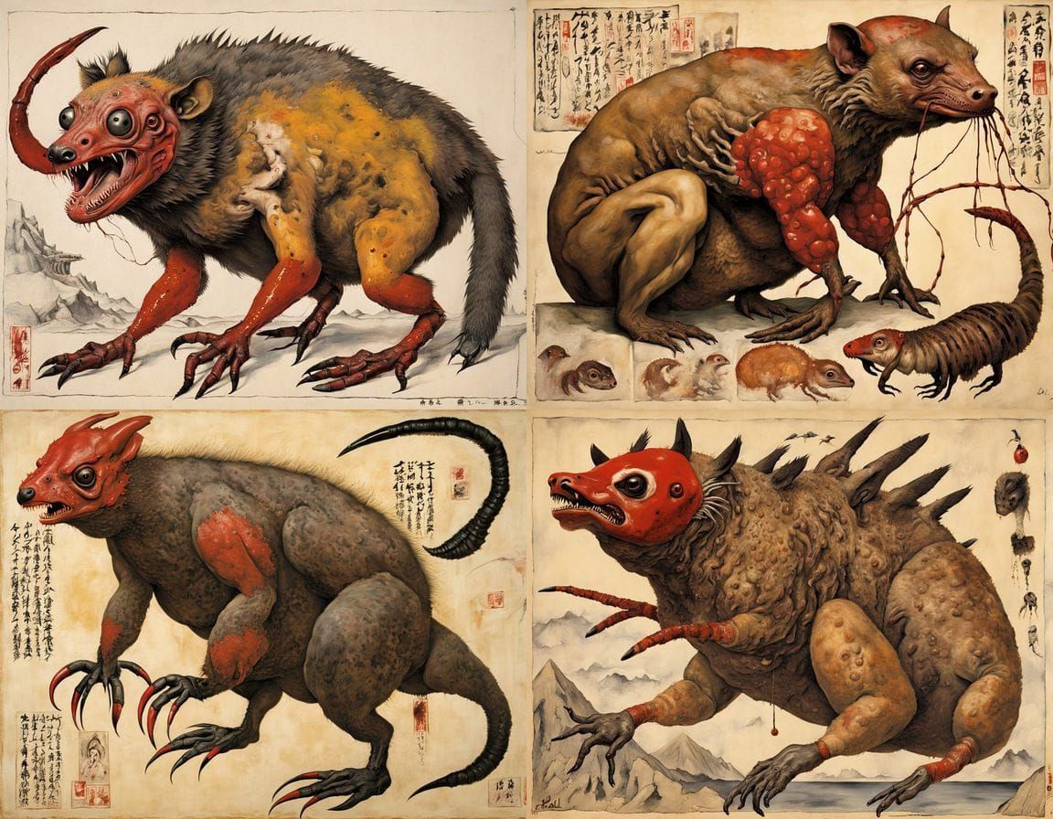 This image depicts a surreal, nightmarish creature with animalistic features, blending elements of horror and Japanese art traditions, evoking a sense of grotesque terror and the darker aspects of human imagination.