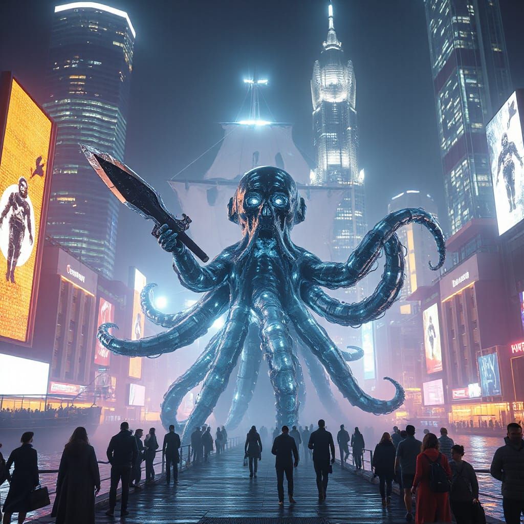 This image showcases a heroic, ghostly octopus pirate, surrounded by futuristic skyscrapers and neon lights, as it wields its scimitar in a blur of motion. A ghostly ship looms in the background, amidst a bustling dock filled with oblivious tourists and holographic advertisements.