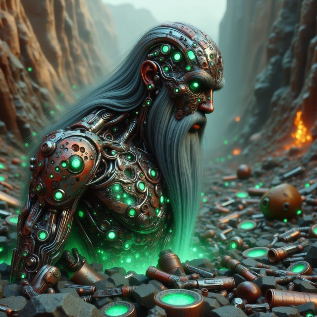 This hyperrealistic charcoal drawing depicts a Viking warrior constructed from salvaged car parts, glowing with ethereal light. A fusion of fantasy and technology with intricate textures.