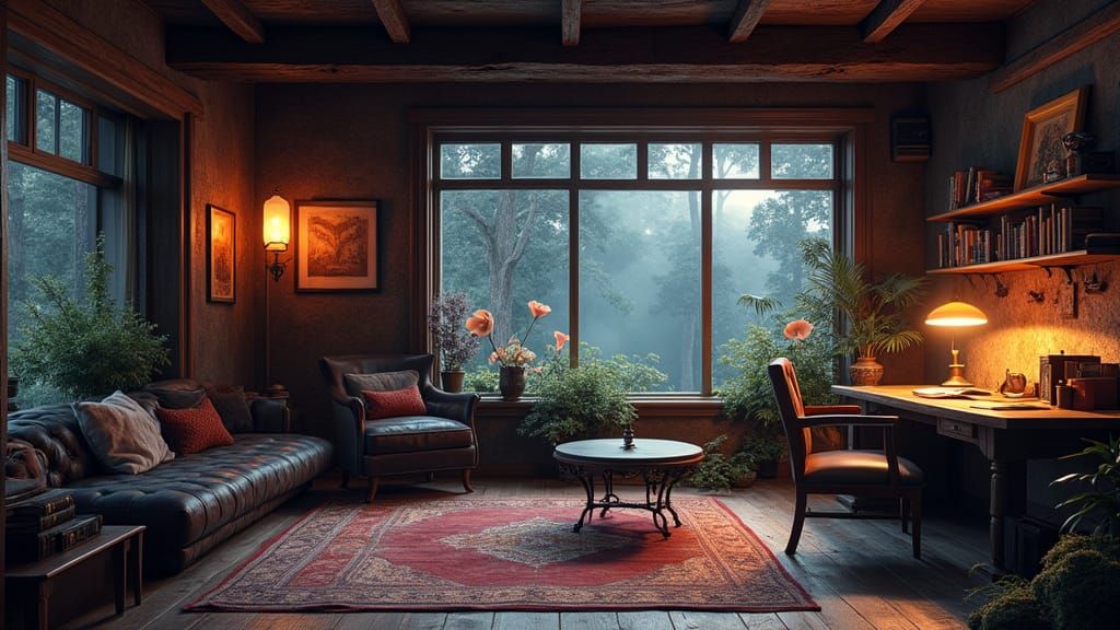This image shows a detailed office interior blending diverse styles. The space features dark wood, stone floors, warm lighting, and panoramic views. It combines cozy and minimalist elements with fantasy-inspired accents and strange artifacts.