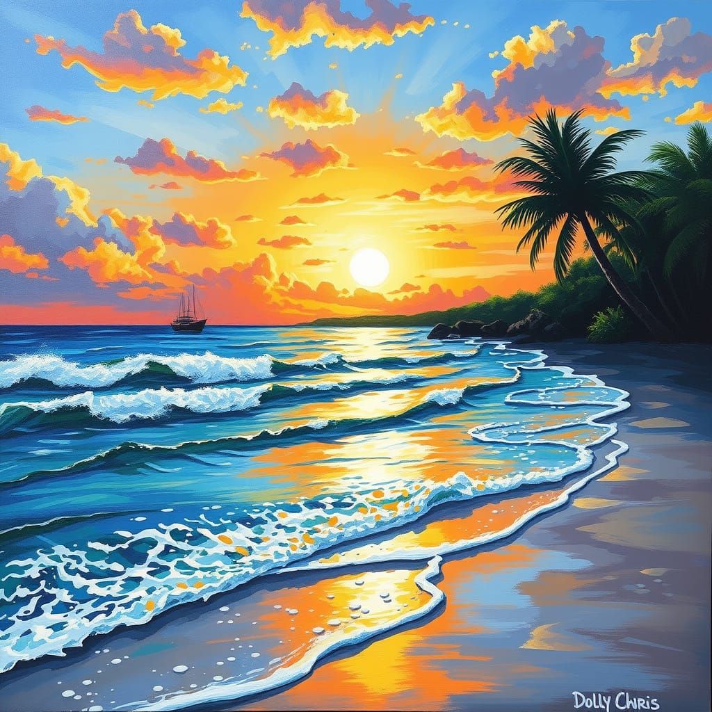 This image shows a sunset over a tropical beach with glistening reflections on the sea. Evokes a vibrant, painterly style reminiscent of impressionism.