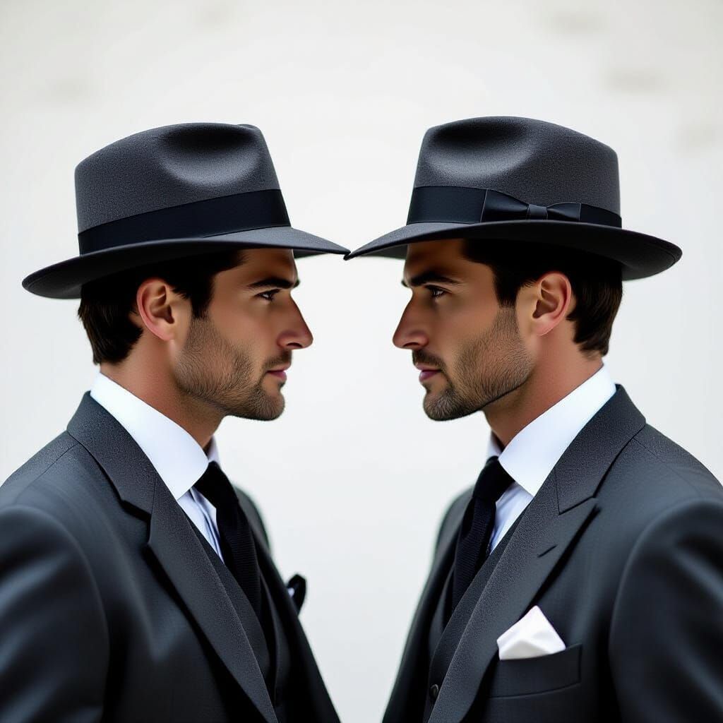 This image shows two handsome men in grey suits and trilby hats, sharing a passionate gaze in soft lighting. The portrait captures subtle expressions with elegant lines and moody shadows.