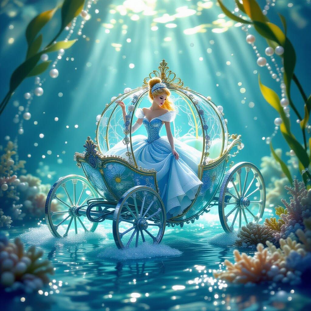 This image features a Cinderella made of sea glass exiting an enchanted carriage adorned with pearls and kelp. Rendered in an Art Nouveau style with luminous, crystalline textures and oceanic colors.