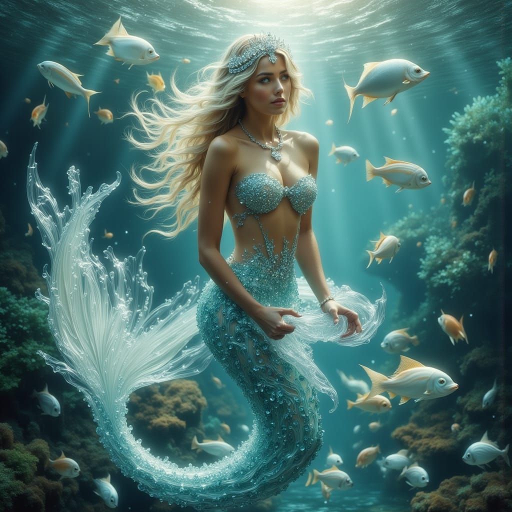 This image shows a beautiful, voluptuous woman with unique Axolotl-like hair and a shimmering mermaid tail. She wears a jeweled tiara and is surrounded by fish in an oceanic scene in dreamy, ethereal style.