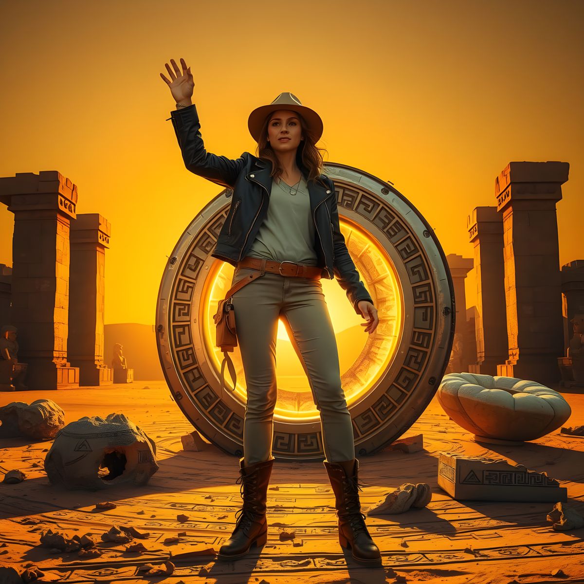 This image depicts a striking scene of an archeologist uncovering an ancient stargate in Egypt, blending historical and sci-fi elements in a captivating visual narrative.