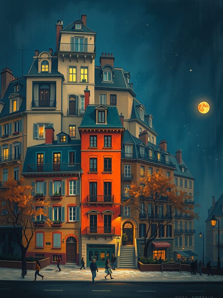 This ultra photo-realistic image captures a European cityscape at dusk. It features densely packed buildings, autumnal foliage, and a bright full moon, rendered with rich colors and atmospheric depth.