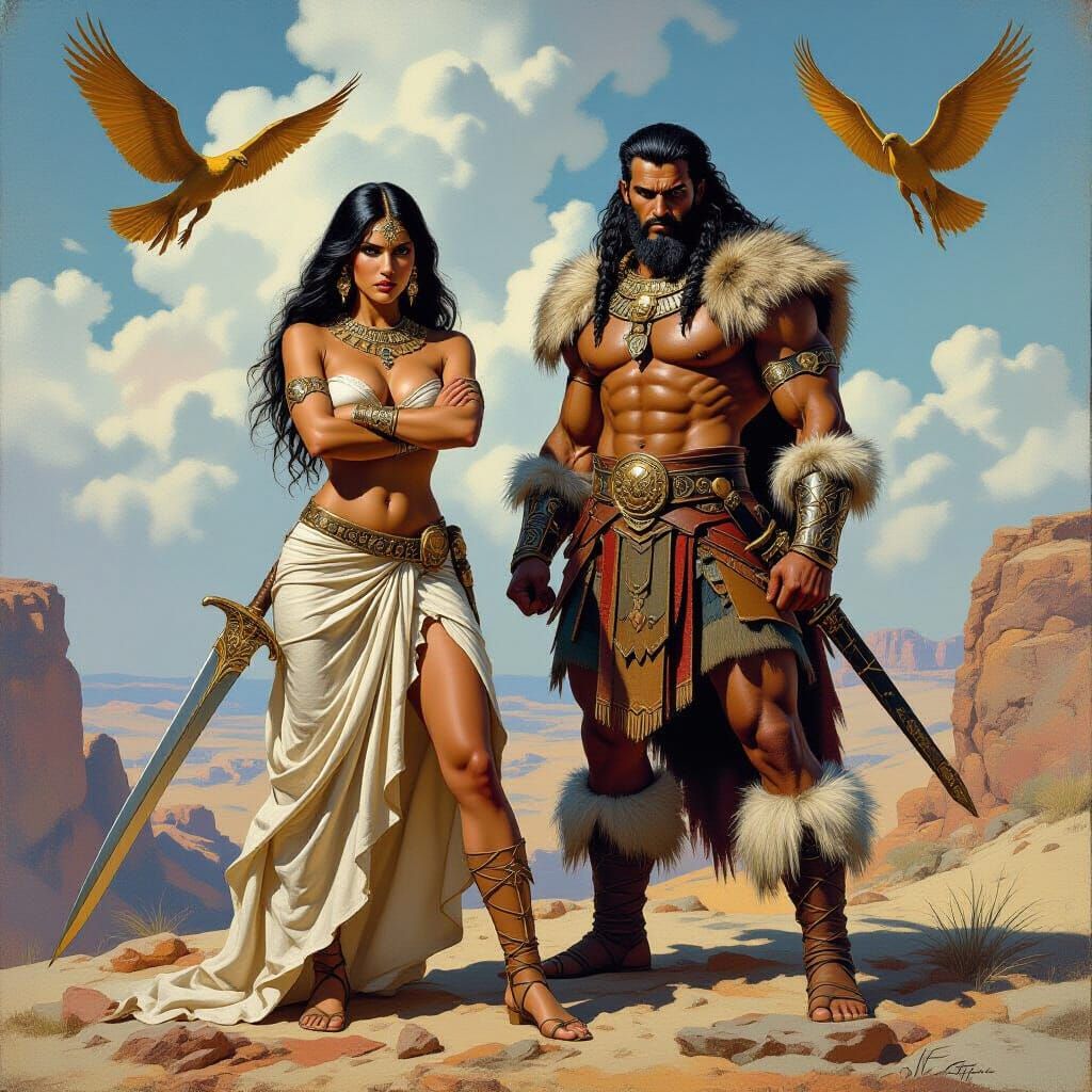 An Egyptian woman in just a skirt, her arms across her chest as she holds a curved sword, and a powerful warrior in rich furs are on a a rocky outcrop. Winged creature fly in the background. Heroic realism style with high contrast and intricate detail, evoking pulp fantasy cover art by Boris Vallejo, ...