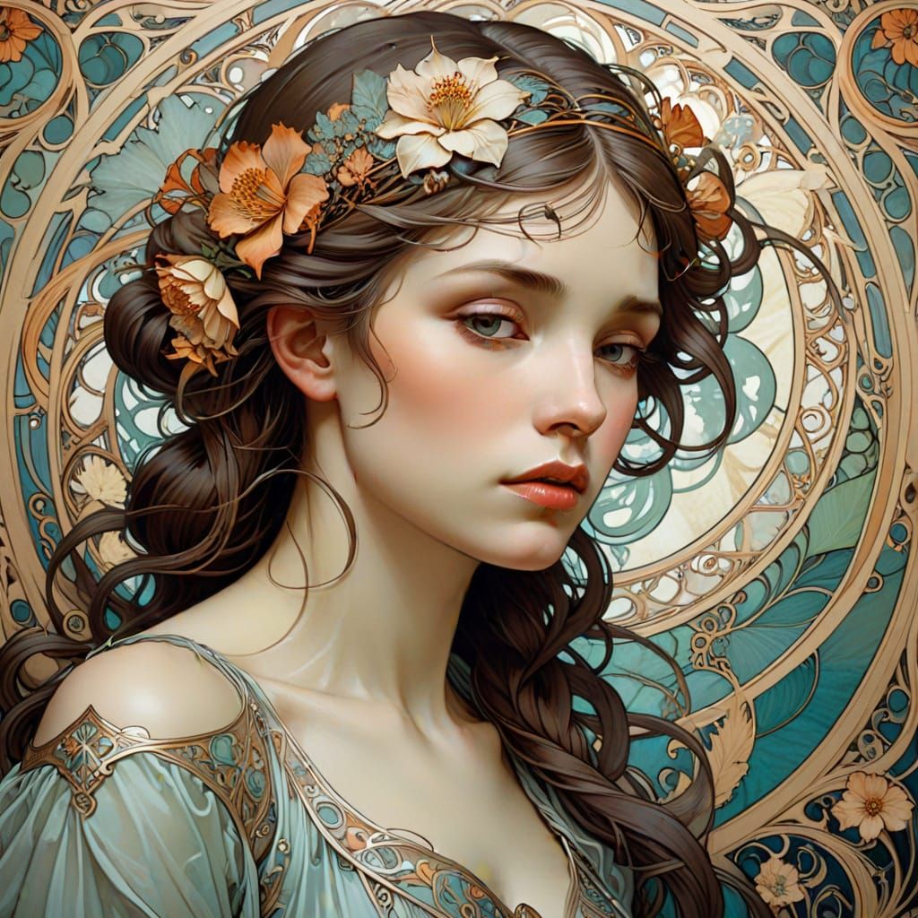 This image shows a melancholic young woman in an ethereal Art Nouveau style. The portrait features intricate lines and florid patterns reminiscent of classic artwork from the era.