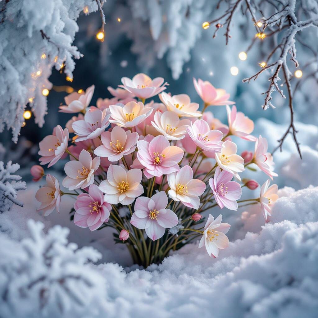 This image shows delicate, translucent pastel ice flowers growing in a cold, snowy cavern. Twinkling fairy lights add a magical touch to the frosty scene.