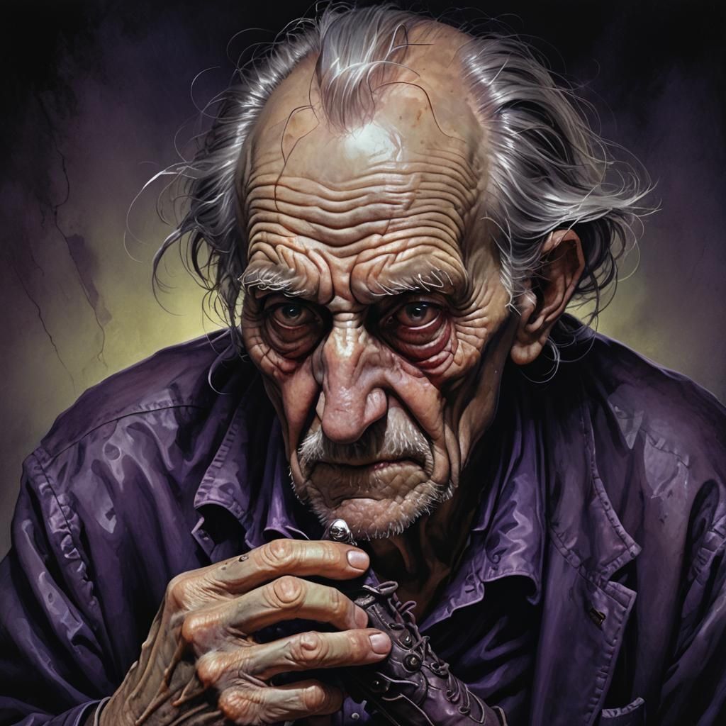 A striking close-up portrait of an elderly, purple, skinny grandpa eating a shoe. The image features detailed textures, eerie atmospheric lighting, and rich, muted colors with a touch of ominous glow in a dark fantasy style.