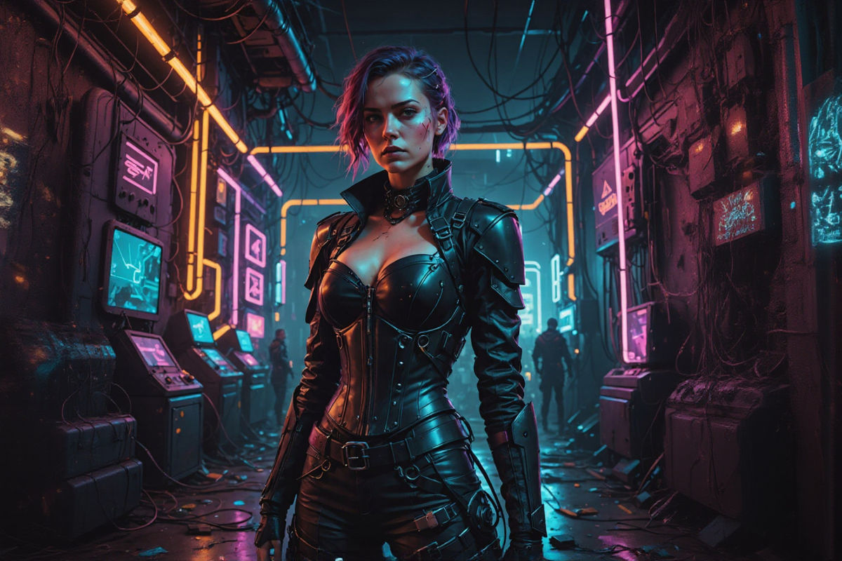 A striking picture of a woman trapped in a dark, surreal world, surrounded by vibrant, pulsing neon lights and bold, industrial lines, in a cyberpunk aesthetic