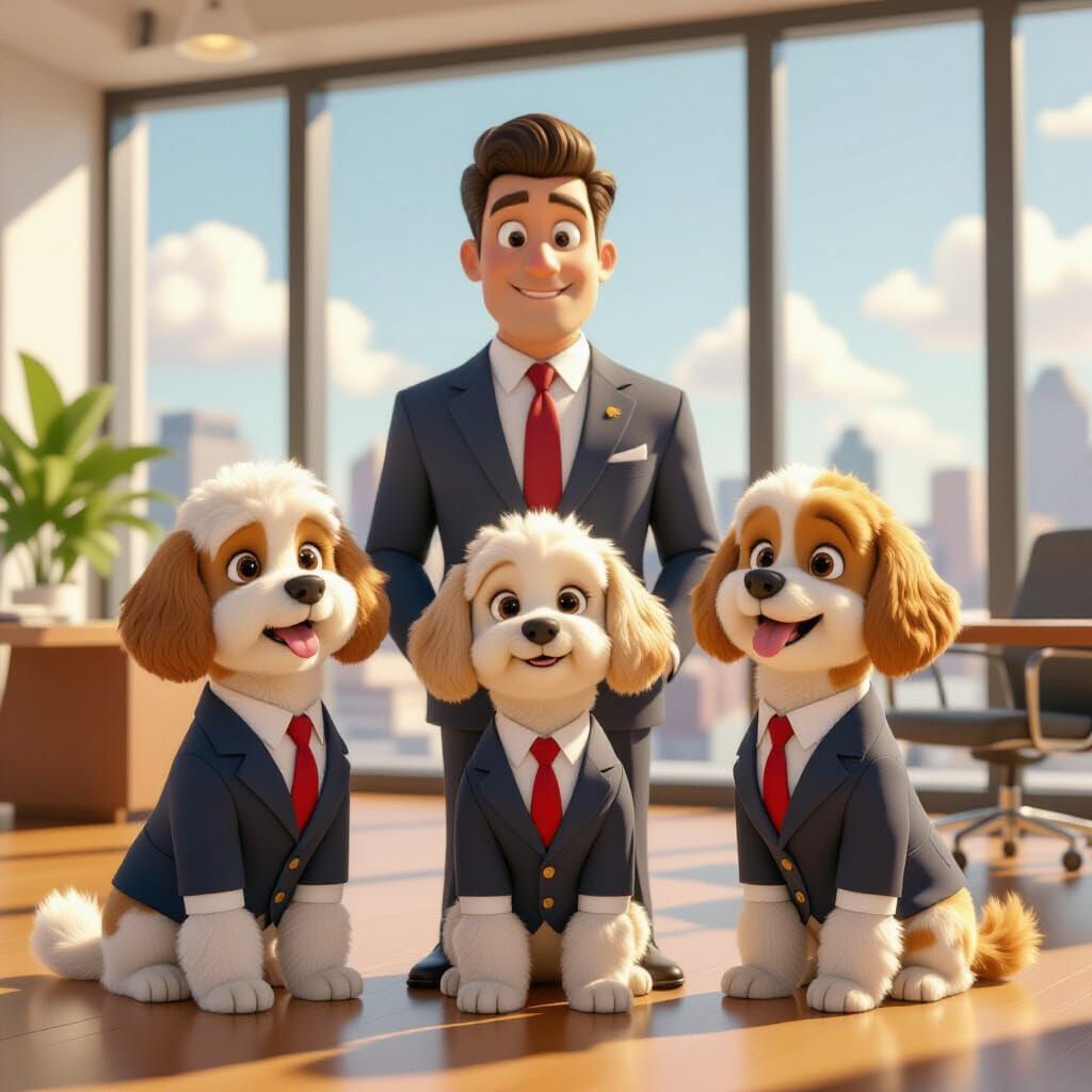 A distinguished man and three cockapoos wear comically oversized suits in a bright, modern office. This image is rendered in a whimsical, vibrant Pixar animation style with a touch of humor.