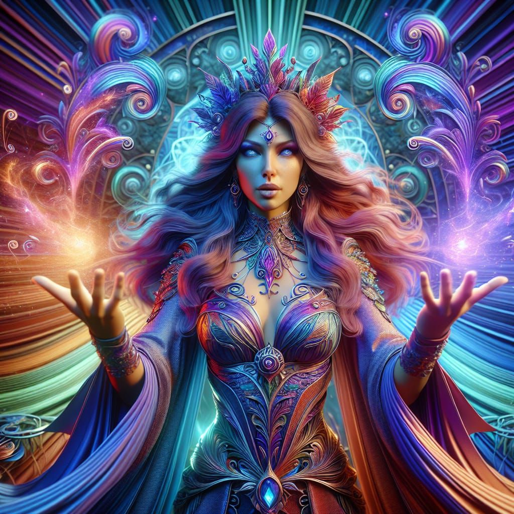 A full-body view of a mystical sorceress conjuring magic. This highly detailed 3D digital art features radiant effects and vibrant colors, with a cinematic radial gradient background.