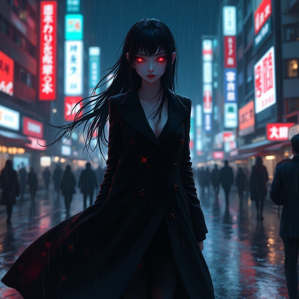 This captivating image showcases a female vampire navigating Tokyo's vibrant, neon-lit streets, her porcelain skin glistening with raindrops, amidst a kaleidoscope of colors from towering skyscrapers and video screens, in a mesmerizing technicolor glow.